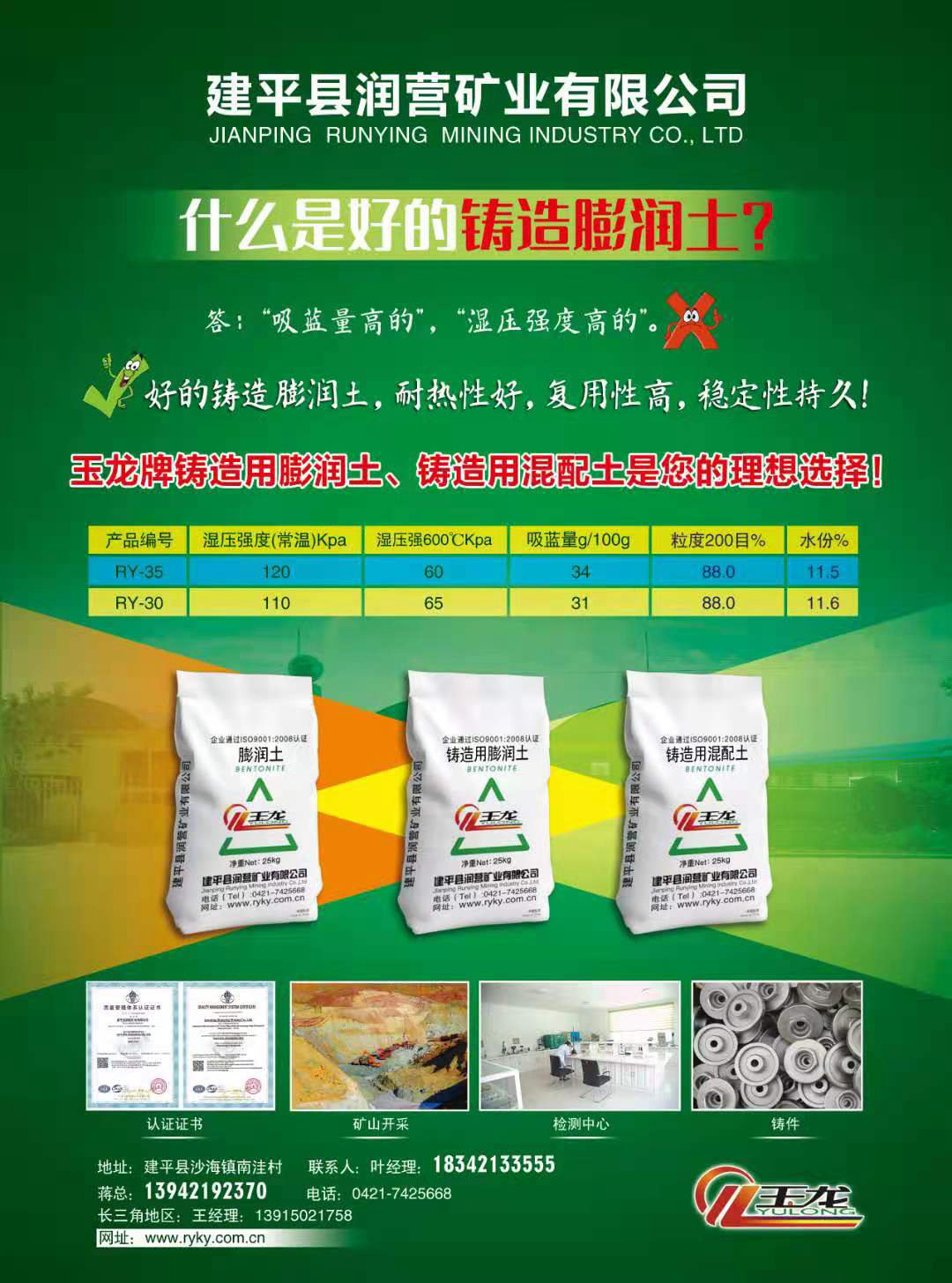 建平县润营矿业有限公司创立于2009年,主要从事膨润土矿的开采加工及其膨润土产品的的销售业务。公司位于中国膨润土之乡辽宁省朝阳市建平县,紧邻叶(柏寿)天(义)线公路和(赤峰至锦州以及承德至锦州)铁路,可直接连接天津、大连、锦州和营口鲅鱼圈港,交通运输十分便利。公司占地面积15万平方米,拥有高质量的膨润土主体矿山及合同矿山多座,可采储量超过1000万吨公司现已形成15万吨的年开采和产品加工能力。公司产品广泛用于铸造、建筑(连续墙和基桩工程、盾构工程、顶管工艺)、钻井泥浆(石油和地质勘探钻井泥浆和HDD水平定向钻进)、冶金球团、环保(垃圾消纳场防水隔离层)、造纸、干燥剂、宠物垫料(猫砂)等领域。公司生产的"玉龙牌"膨润土产品得到了国内外广大客户的认可。公司拥有完备的实验室设备和有经验的技术人员,除对生产的产品进行实时监控,以保障产品的质量外,还为新产品的开发、研制提供了可靠的技术保障。公司已经通过了ISO9001(2008版)质量认证。润营公司与国内外著名膨润土厂商有着广泛的合作和技术交流,在总结国内外膨润土生产、加工、使用的经验及对当地膨润土资源认识的基础上,润营公司在产品技术指标的制定、生产工艺流程的设计及设备的选型等方面均有独到之处。